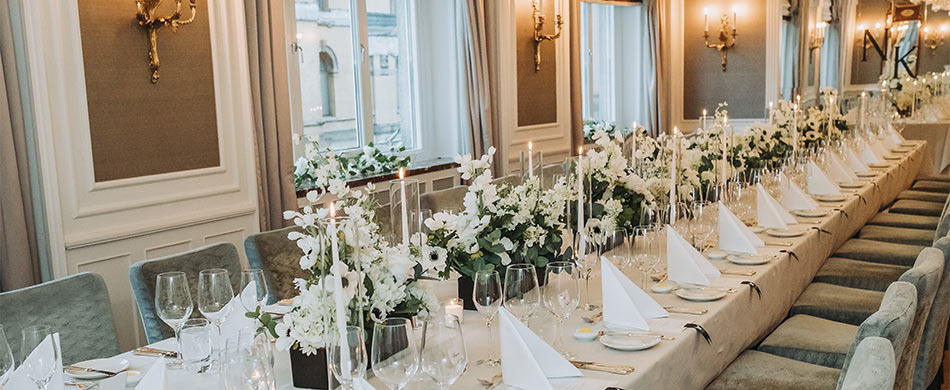 Når hver minste detalj teller, er det trygt å vite at noen tar hånd om dem. Vi kan tilby unike bryllupslokaler, erfarne hovmestere, smakfulle menyer, blomsterdekorasjoner, bryllupssuite og personlig rådgivning. Sammen legger vi planene – vi gjennomfører dem!