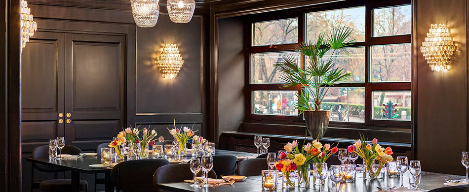 Caroline is a flexible venue for meetings and parties, and can accommodate up to 60 guests for conferences and 150 guests for dinners. The venue looks out over the bustling crowds of Oslo around the National Theatre.